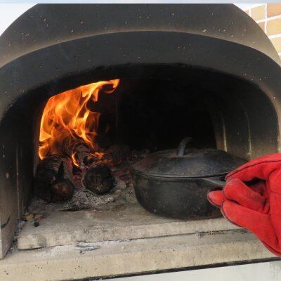 均一な放射熱によって効率よく調理できるのがドーム型の利点です。豪快に薪を放り込んで、窯の温度をあげていけば(約60分)ピザを焼くのに必要な高温にすることができます。